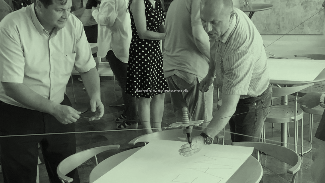"Tegnemaskinen" - grafisk visualisering på den skæve måde! Deltagerne har indledningsvis en drøftelse om en udvalgt tematik og er blevet bedt om at foreslå 2-3 symboler som er dækkende for tematikken.Først derefter præsenteres de for tegnemaskinen, som er værktøjet de skal tegne symbolerne med. Nu bliver det vanskeligt og der skal holdes styr på snore, tusch, retning og hastighed. Der sluttes af med en fernisering, hvor hver gruppe præsenterer deres "kunstværk"og tankerne der lå bag.